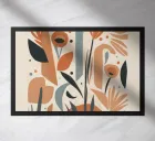 A modern abstract composition of various stylized botanical shapes and leaves in a palette of terracotta, beige, and dark blue against a light background.