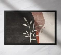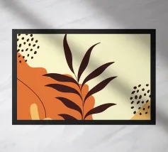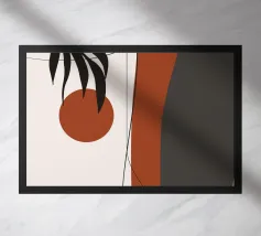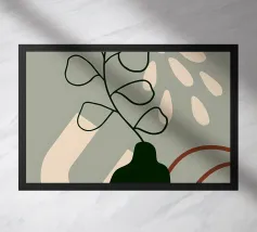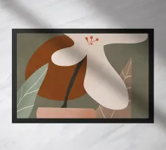 Des lignes abstraites et des blocs de couleurs sourdes créent une composition moderne à l'esthétique minimaliste. Une plante stylisée et un vase simple ajoutent des éléments organiques, contrastant avec des formes géométriques.