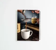 café grains de café passoire tasse vapeur pot en cuivre filtre à café verser boisson chaude planche en bois morceaux de chocolat table cadre de cuisine mains tasse fond noir vapeur montante processus de cuisson boisson du matin brassage