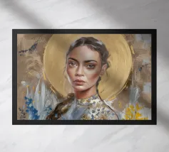 Portrait délicat d'une femme aux cheveux blonds ou châtains clairs, les yeux fermés ou regardant vers le bas, portant un vêtement bleu et argenté ou blanc aux détails complexes, évoquant la dentelle ou l'armure.