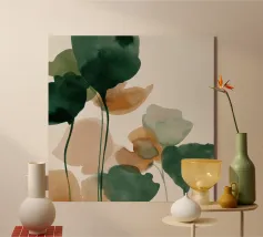 Una delicata composizione di foglie di eucalipto rese in morbide e traslucide tonalità della terra. Questa opera d'arte botanica astratta e minimale evoca un senso di calma e consapevolezza, perfetta per gli interni moderni ispirati al benessere.