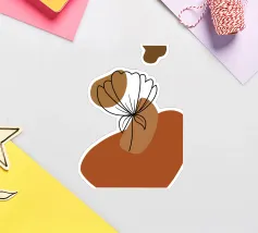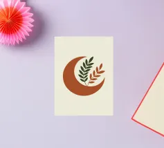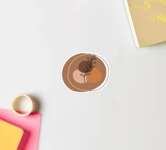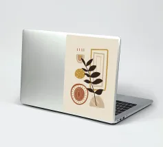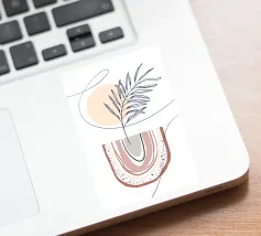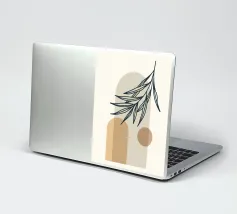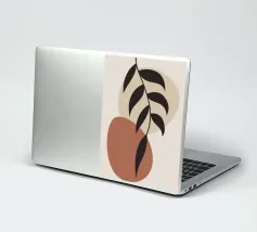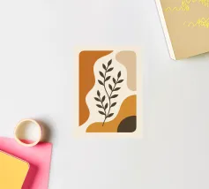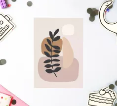 Una composizione astratta presenta un semplice sfondo geometrico marrone e beige con un delicato disegno al tratto di un ramoscello frondoso. Il design minimalista enfatizza gli elementi naturali in un equilibrio armonioso.
