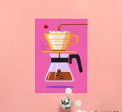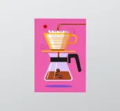 Illustrazione grafica di una caffettiera in azione, su uno sfondo rosa intenso. La rappresentazione moderna e stilizzata è un perfetto omaggio all'arte e al rituale del caffè speciale.