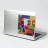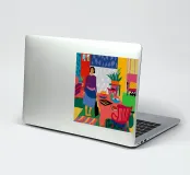 Una donna รจ immortalata nel suo elemento creativo, seduta alla scrivania con un computer portatile in una stanza accogliente e colorata, piena di tocchi personali, che incarna lo spirito di un moderno creatore a casa.