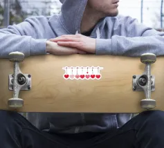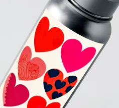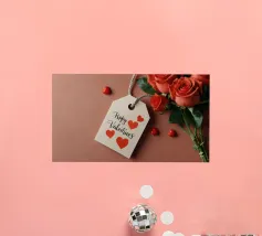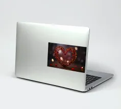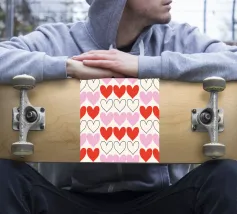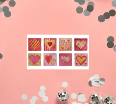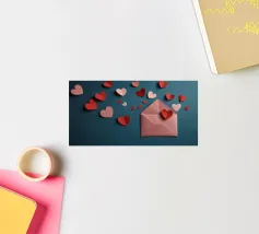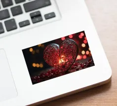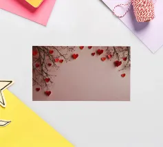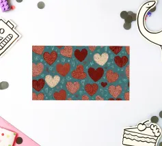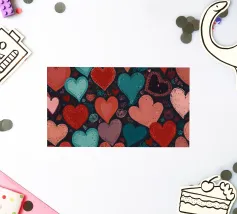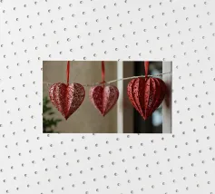 Un filo ornato da ritagli a forma di cuore in varie tonalità di rosso è appeso su uno sfondo scuro. Morbide luci calde illuminano i cuori, creando un'atmosfera romantica per San Valentino.