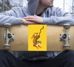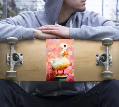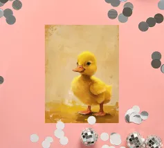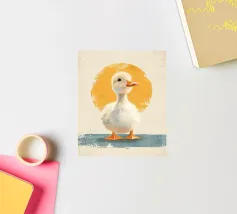 Un simpatico anatroccolo fa capolino da sotto un morbido asciugamano bianco. Le sue soffici piume gialle e i suoi occhi curiosi creano una scena adorabile e affascinante.