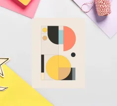 L'opera d'arte presenta una disposizione dinamica di forme geometriche dai colori vivaci. Cerchi, rettangoli e linee si intrecciano, creando un senso di movimento ed equilibrio.
