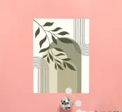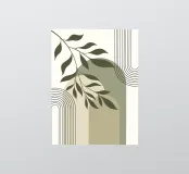 Un ramo di foglie si sovrappone a forme geometriche, tra cui linee arcuate e toni sfumati e stratificati. La combinazione crea un connubio armonioso tra natura e design astratto.