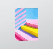 Illustrazione a guazzo di gradini gialli davanti a pareti a strisce rosa-blu-gialle. Sfondo minimalista, linee decise, forme geometriche e composizione chiara. Blocchi di colore vivaci in tonalità pastello di rosa, blu, giallo e bianco creano un'illustrazione astratta, vivace ed estetica.