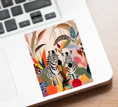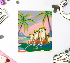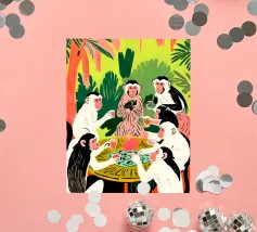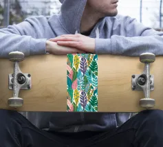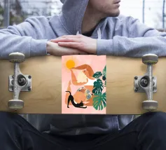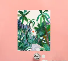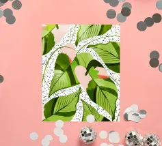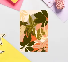 Questa vibrante opera d'arte presenta una composizione dinamica di foglie tropicali in colori audaci e contrastanti. L'opera presenta un mix di fogliame verde intenso, rosa tenue e arancione brillante, con intricati motivi di venature che aggiungono consistenza e dettagli. Il gioco di toni caldi e freddi crea un'atmosfera vivace ed energica, mentre lo sfondo pulito color crema permette alle foglie di risaltare in modo evidente. L'approccio grafico e stilizzato conferisce all'opera un'estetica moderna e giocosa, evocando la bellezza lussureggiante della natura in un design contemporaneo.