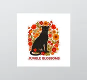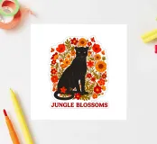 Sagoma di pantera nera circondata da fiori arancioni e rossi. Tavolozza calda, motivo floreale caratteristico; ideale per progetti audaci, tessuti grafici e accessori.