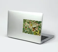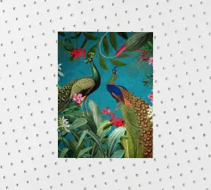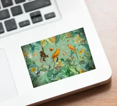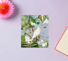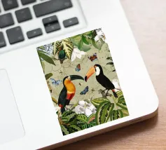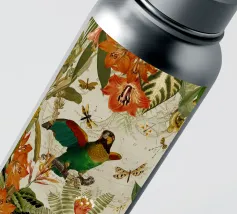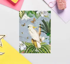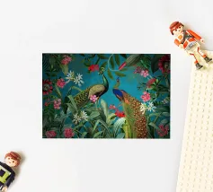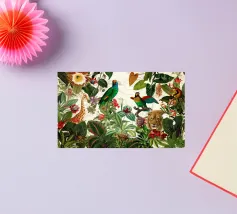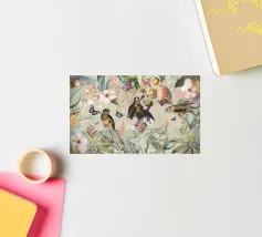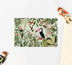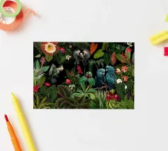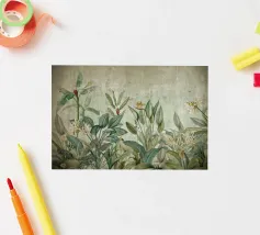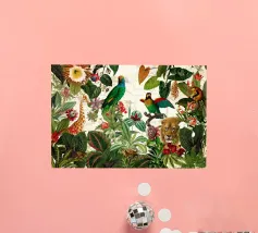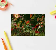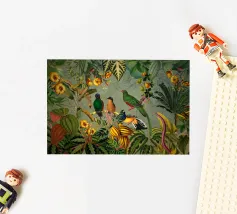 Un vivace collage di illustrazioni vintage con bellissimi e colorati pappagalli verdi appollaiati in mezzo a un lussureggiante paesaggio floreale. La scena è ricca di fascino tropicale ed esotico, poiché i pappagalli si stagliano sullo sfondo del fogliame vibrante della giungla. Intorno a loro sbocciano incredibili fiori esotici, mentre i rami di palma aggiungono un tocco di eleganza tropicale. Sullo sfondo, una mappa d'epoca emerge dolcemente, aggiungendo un senso di avventura e di viaggio. Questa miscela armoniosa di natura, fauna selvatica e fascino vintage crea un disegno senza tempo, perfetto per gli amanti dei paesaggi esotici e dell'arte nostalgica.