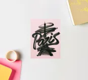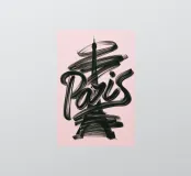 Questo poster moderno presenta la Torre Eiffel leggermente delineata dietro pennellate calligrafiche nere e dinamiche che scrivono "Paris" su uno sfondo rosa tenue.