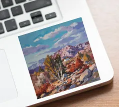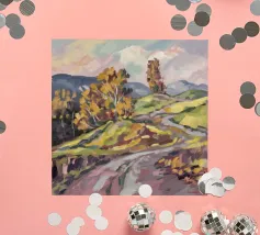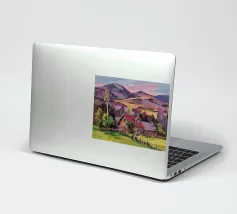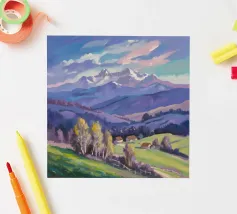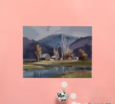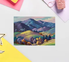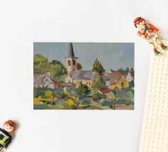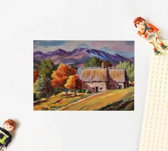 Un pittoresco paesaggio autunnale che raffigura un villaggio o una fattoria adagiata su una collina, circondata da un mosaico di alberi colorati nei toni dell'arancione e del giallo e da campi coltivati, con le lontane montagne blu a completare la scena.
