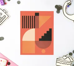 Primo piano astratto e minimalista di una forma architettonica, con una scala bianca e spoglia su una parete arancione con una finestra circolare nera e ombre profonde.