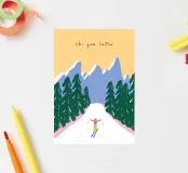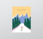 "Ski you later" - un gioco di parole tipografico incontra una colorata illustrazione invernale. Uno sciatore scivola rilassato lungo una pista bianca, circondato da abeti scuri e montagne viola. Il cielo si illumina di un caldo giallo pastello e conferisce alla scena un accenno di tramonto. Questo poster combina gli sport invernali con l'umorismo e una varietà di colori: un allegro richiamo per tutti gli amanti dello sci e della montagna.