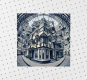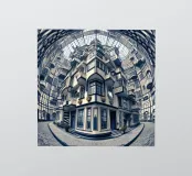 Una splendida vista fisheye di un atrio futuristico caratterizzato da un'architettura geometrica, balconi e un soffitto a cupola di vetro. L'intricato gioco di forme e luci crea un design urbano coinvolgente e di grande impatto visivo.