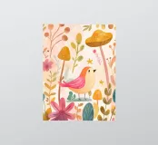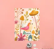 Un dolce uccellino rosa si trova tra funghi dorati e fiori soffici in questo giardino boho da sogno. Dipinta in calde tonalità di acquerello, l'opera d'arte fonde la dolcezza del capriccio e la calma della natura, perfetta per le pareti di asili nido, salotti accoglienti o per chiunque ami il fascino morbido e moderno delle fiabe. Portate un tocco di magia e serenità nel vostro spazio con questa stampa pastello del bosco.