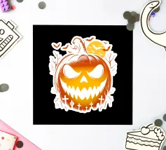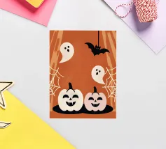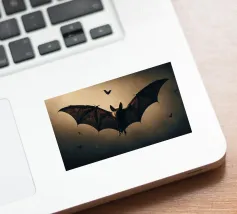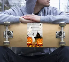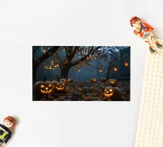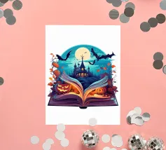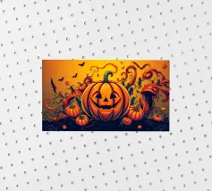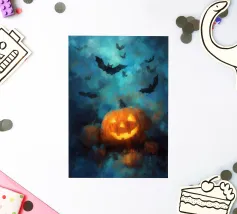 Al calare del crepuscolo, una strega in silhouette vola a cavallo della sua scopa tra i pipistrelli, con una zucca incandescente in primo piano, creando un'atmosfera incantevole.
