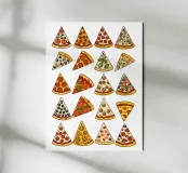 Questo stravagante e colorato motivo alimentare presenta una deliziosa varietà di fette di pizza a fumetti su uno sfondo bianco pulito. Con diversi condimenti come salame piccante, olive, funghi, pomodori e basilico, questa illustrazione è perfetta per l'arte murale della cucina, per il design del menu di una pizzeria o come elemento di un divertente motivo senza cuciture. Ideale per lo scrapbooking digitale, la stampa su tessuto o la creazione di adesivi e decalcomanie giocose, questa grafica vettoriale di alta qualità trasmette un'atmosfera allegra e appetitosa. Cercate questa simpatica illustrazione di pizza per aggiungere un tocco vivace e ispirato alla gastronomia ai vostri progetti commerciali o personali.
