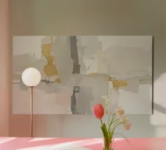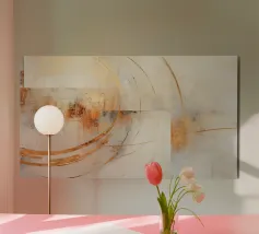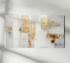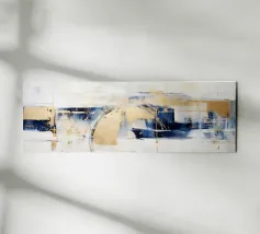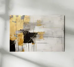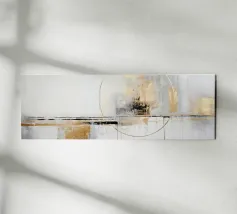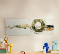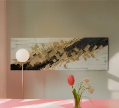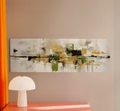 Quest'opera d'arte è una composizione astratta in formato panoramico, caratterizzata da un mix dinamico di texture, colori e forme geometriche. La texture è ricca, con pennellate visibili e strati di colore che creano un'atmosfera speciale. Il gioco di toni verdi e terrosi con accenti metallici conferisce all'opera un'energia armoniosa e vibrante.