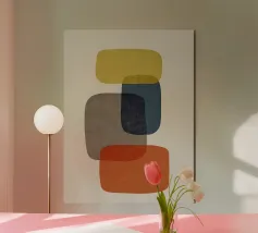 Questo poster d'arte moderna mostra forme sovrapposte e arrotondate in colori vivaci come il blu, il rosso, l'arancione, il rosa e il giallo, apparentemente fluttuanti e interconnesse. L'effetto trasparente dei colori crea profondità e leggerezza allo stesso tempo. Ideale per stanze minimaliste, uffici creativi o come elegante elemento di spicco nella parete della vostra galleria.