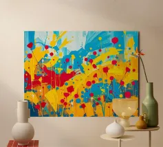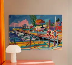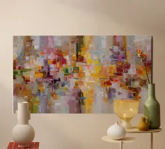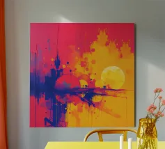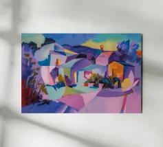 Quadro astratto dinamico che presenta un'architettura surreale, vivaci toni arancioni e blu, alberi astratti e sfere fluttuanti in un paesaggio fantastico. I tratti strutturati e i contrasti decisi creano un'atmosfera onirica ed energica.