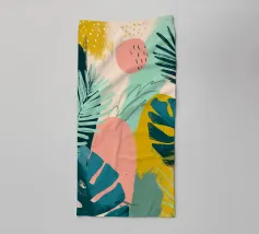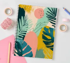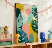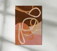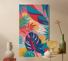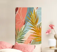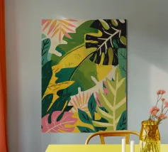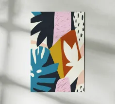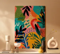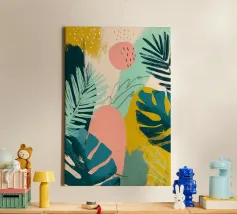 Una giocosa composizione astratta, ricca di audaci forme ispirate alla giungla e di pennellate vivaci. Questo disegno a mano combina verde acqua, blush, senape e menta in un layout gioioso e contemporaneo, perfetto per ravvivare gli interni moderni con un tocco tropicale.