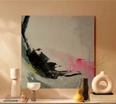 Ampia pittura astratta gestuale nei toni del rosa, del magenta, del marrone, del nero e del grigio con pennellate smaltate beige chiaro.