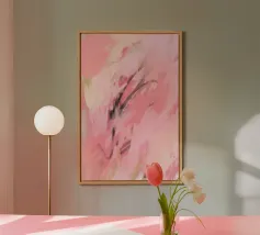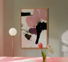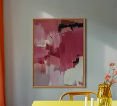 Ampia pittura astratta gestuale nei toni del rosa, del magenta, del marrone, del nero e del grigio con pennellate smaltate beige chiaro.