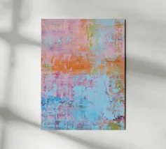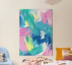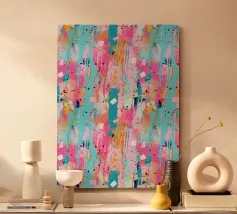 Le vibranti tonalità di rosa, blu e turchese si fondono in un vivace disegno astratto, creando un senso di movimento ed energia. I tratti audaci e i colori stratificati evocano un'atmosfera dinamica ed espressiva.