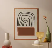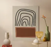 Quadro astratto moderno con forme organiche nei toni caldi del marrone e dell'arancione e linee nere. Opera d'arte minimalista con pennellate nere su sfondo beige. Adatto a stili di vita e interni bohémien, moderni, basici, industriali e scandinavi. Ideale per la camera dei bambini, la camera da letto, il soggiorno o l'ufficio.