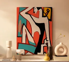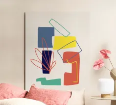 Forme astratte e pennellate decise nei toni della terra si combinano con uno sfondo chiaro. La composizione presenta rettangoli sovrapposti e schizzi a forma libera, creando un look dinamico e moderno.