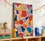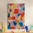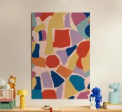 Un motivo astratto vivace e giocoso presenta forme colorate sparse come scaglie di terrazzo su uno sfondo neutro, creando un design festoso e moderno.