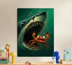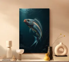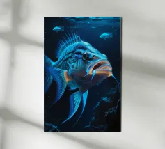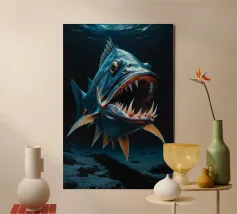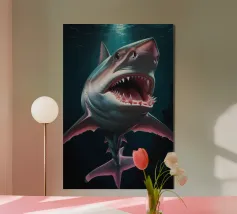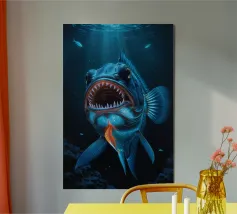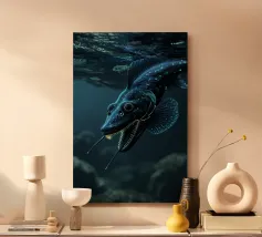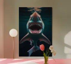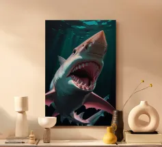 Questa rappresentazione iperrealistica di un predatore delle profondità marine mette in mostra i suoi denti affilati e la sua bocca cavernosa, pronta a colpire nell'eterna oscurità delle profondità oceaniche. I riflessi luminosi nei suoi giganteschi occhi neri aggiungono un tocco inquietante, alludendo a un cacciatore di vertice costruito per sopravvivere negli abissi. I raggi d'acqua illuminati dall'alto creano un contrasto inquietante con il suo corpo blu scuro, quasi metallico. Questa opera d'arte digitale cattura perfettamente il terrore e la bellezza dei più temibili abitanti dell'oceano.