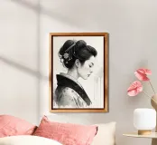 Aggiungete un tocco di eleganza con questa stampa monocromatica di geisha ad acquerello. Il profilo dettagliato della geisha e il suo kimono contrastano con le sfumature morbide ed eteree dell'inchiostro, creando un'opera d'arte d'ispirazione giapponese minimalista ed emozionante.
