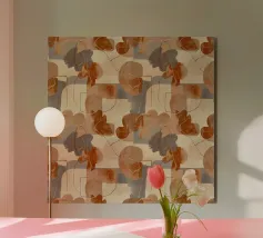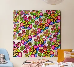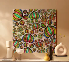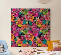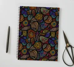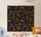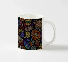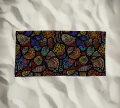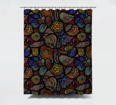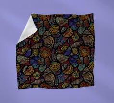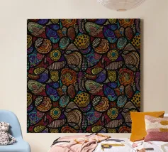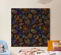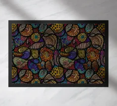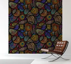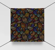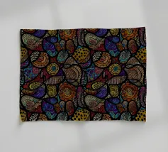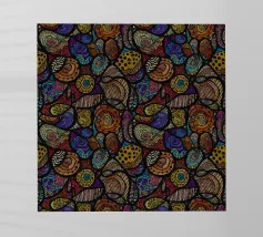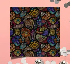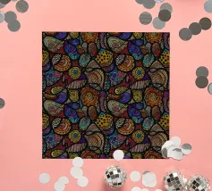 Un audace e vibrante motivo astratto con cerchi colorati, vortici e forme geometriche in ricche tonalità gioiello tra cui verde acqua, arancione, viola, giallo, magenta e marrone su sfondo nero. Questo energico disegno si ispira ai modelli tessili africani e all'arte etnica con la sua disposizione dinamica di motivi decorativi. Perfetto per gli amanti dell'arte culturale, per gli appassionati di motivi audaci e per tutti coloro che apprezzano i disegni vibranti di ispirazione etnica con il massimo impatto cromatico.