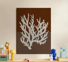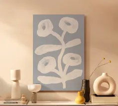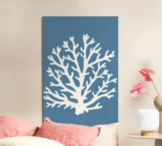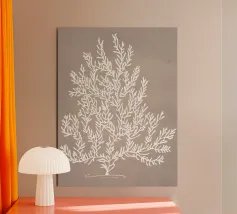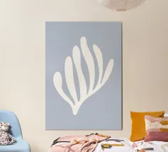 Opera d'arte minimalista con alghe bianche astratte o forme simili a coralli su uno sfondo grigio-blu tenue. Perfetto per un'estetica moderna e organica.