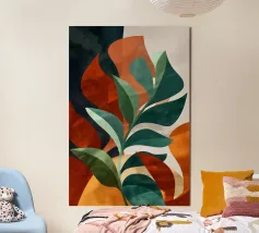 Un'audace composizione astratta presenta forme organiche in vibranti tonalità di arancio, blu e verde. Una grande forma verde simile a una foglia contrasta con il caldo sfondo arancione e rosso.