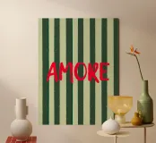 Questa stampa presenta la parola "AMORE" in caratteri rossi su uno sfondo a strisce verdi chiare e scure. Un'opera d'arte elegante, ideale come regalo per gli amanti della decorazione moderna, del romanticismo e dell'arte da parete ispiratrice - perfetta per salotti, uffici e occasioni speciali.