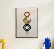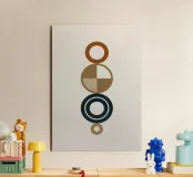 Una composizione astratta pulita e rilassante, caratterizzata da una pila verticale di cerchi e anelli concentrici, che crea un moderno look "totem". La tavolozza è decisamente terrosa e sofisticata e utilizza i toni caldi dell'arancione bruciato/terracotta, del marrone moka, del beige e di un profondo blu navy. Il cerchio centrale è suddiviso in colori pieni, bianco e una sezione di linee orizzontali bianche. Su un morbido sfondo bianco sporco, questo pezzo incarna un'estetica Mid-Century Modern con un tocco bohémien contemporaneo. Questo download digitale di alta qualità (7000x5000 pixel, 300 dpi) garantisce una qualità di stampa superiore.