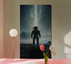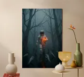Questa opera d'arte oscura e cinematografica fonde fantascienza e orrore in una potente scena surreale. Un astronauta attraversa una foresta nebbiosa e infestata, circondato da mani inquietanti che emergono dall'acqua sottostante. Nella sua mano, un cuore incandescente proietta una luce calda contro la fredda atmosfera blu, simboleggiando la speranza, l'umanità e la sopravvivenza nell'ignoto. L'illuminazione tetra, gli alberi nebbiosi e il contrasto drammatico creano una storia visiva intensa ed emozionante. Perfetto per gli appassionati di dark fantasy, space art, temi psicologici e decorazioni murali d'atmosfera, questo disegno aggiunge mistero e profondità.