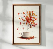 Un delicato gioco di vapore e fogliame, dove il calore di una tazza di caffè sboccia in una cascata di foglie autunnali. "Autumn Brew" celebra la tranquilla poesia dei rituali quotidiani, fondendo il minimalismo con la vibrante tavolozza dell'autunno.