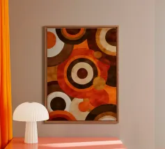 Forme rotonde, irregolari, vagamente di ciottoli e zucche, sovrapposte, nei colori autunnali di rosso, arancio, marrone e grigio. Moderno ma con un'atmosfera da metà secolo.