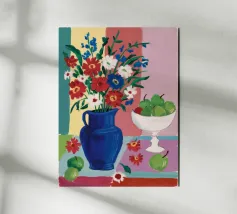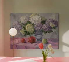 Una vivace composizione di natura morta con profumati lillà viola in un vaso blu intenso, accanto a un vaso blu più piccolo, mele verdi e limoni gialli, il tutto su un allegro sfondo giallo.