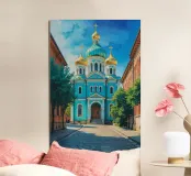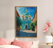 Questa vibrante cattedrale di Kiev affascina con la sua straordinaria facciata azzurra e le cupole dorate che brillano sotto il cielo blu brillante. Affiancata da edifici storici in mattoni e da una vegetazione lussureggiante, si trova alla fine di una pittoresca strada di ciottoli, che emana fascino e serenità. I dettagli intricati e i colori vivaci della cattedrale ne fanno un capolavoro architettonico. Una miscela perfetta di fede, arte e storia, che racchiude l'essenza dell'identità culturale e spirituale di Kiev.
