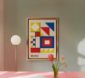 Un manifesto digitale molto complesso che celebra la fondazione del Bauhaus nel 1919, fortemente ispirato ai principi di De Stijl. La composizione è una griglia frammentata di quadrati e rettangoli, riempita con varie suddivisioni geometriche come triangoli e quadrati annidati. L'iconica tavolozza di colori primari, rosso, blu e giallo, oltre al bianco, crea un'opera astratta vibrante, strutturata e visivamente accattivante. Le spesse linee nere definiscono i confini e la struttura, incarnando l'estetica funzionalista del modernismo minimalista. Questo download digitale di qualità superiore vanta 7000x5000 pixel a 300 dpi, garantendo un'eccezione