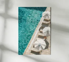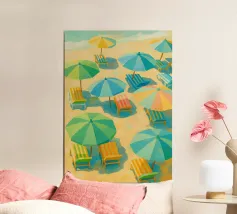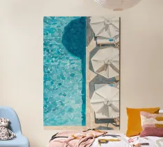 Una suggestiva veduta aerea ad acquerello mostra una vista a volo d'uccello della spiaggia: le dolci onde incontrano la sabbia dorata, mentre alcuni ombrelloni bianchi aggiungono accenti allegri. I delicati colori dell'acqua e la prospettiva minimalista creano una sensazione di estate, di relax e di leggerezza costiera, ideale per le stampe d'arte costiera moderna.