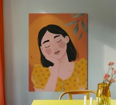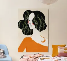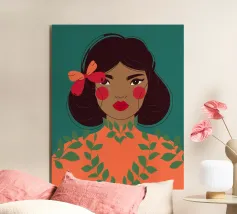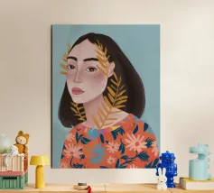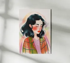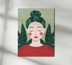 Un'illustrazione vivace e moderna di una donna con gli occhi chiusi, avvolta in un cappotto colorato ispirato alla natura. Le texture audaci e i motivi botanici simboleggiano la forza interiore, l'emancipazione e l'espressione di sé. Quest'opera d'arte irradia calore e fiducia, rendendola perfetta per interni contemporanei, studi creativi o qualsiasi spazio che celebri l'energia e l'individualità femminile.