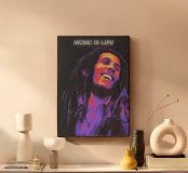 Un ritratto luminoso di un uomo sorridente con i dreadlocks e la citazione "La musica è vita", che cattura la gioia, la positività e lo spirito della musica.